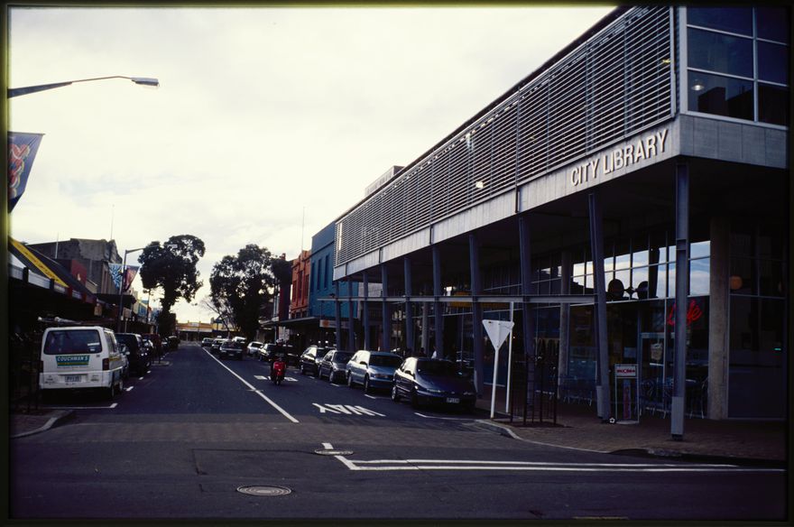 Corner of George and Main Streets, looking down to Cuba Street. The City Library is situated on the right hand side.. The Palmerston North City Council leases to businesses on the ground floor.