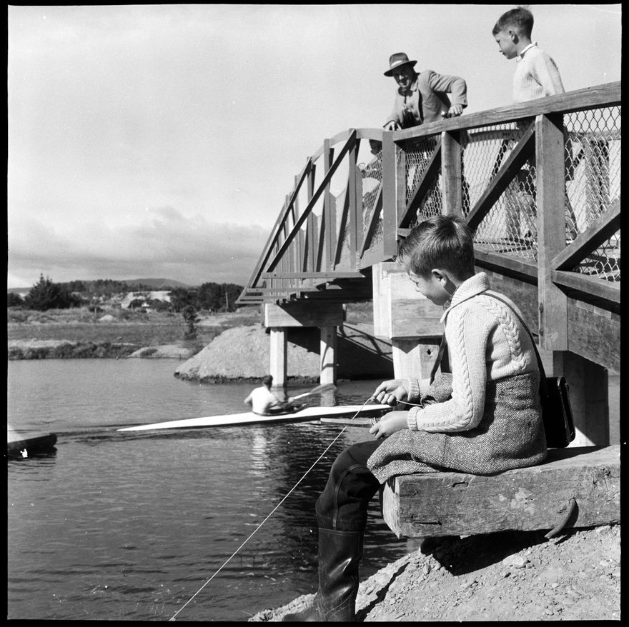 This image was taken for a story that ran in The Manawatu Evening Standard on 01 April 1961 "Billy Sutton, doing a spot of quiet fishing for eels, reflects on the effects of the splashes of a canoeist on his chances. He was fishing from the bridge over Centennial Lagoon this morning when the national canoe championships were being held."