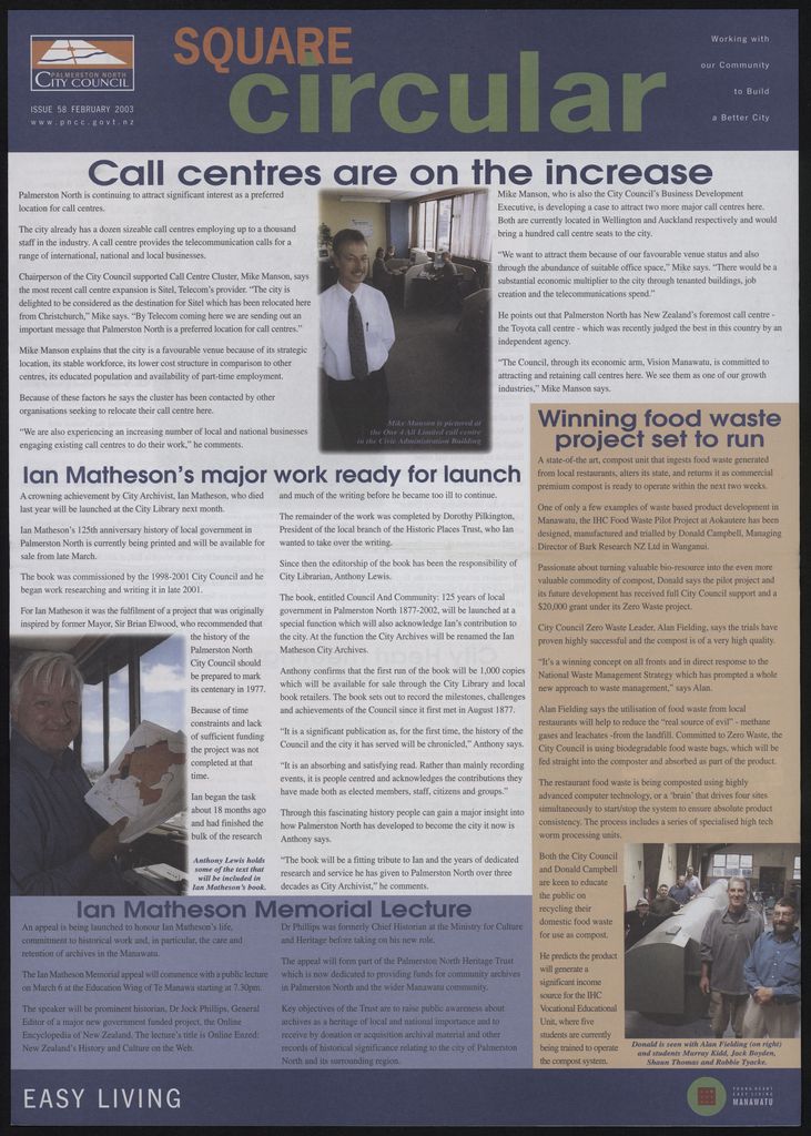 The Square Circular was Palmerston North City Council's monthly community publication, informing Palmerstonians of PNCC initiatives, activites, and events. This month's issue includes: Call centre; Ian Matheson; archives; library; Te Manawa; Ethnic centre; composting; events funding; City Alive!; City Heart; City Future; draft annual plan zero waste day; Festival of cultures; Esplanade open day; Sledge track; Lynne Pope; cycling; Caccia Birch; Convention centre; Esplanade scenic railway.