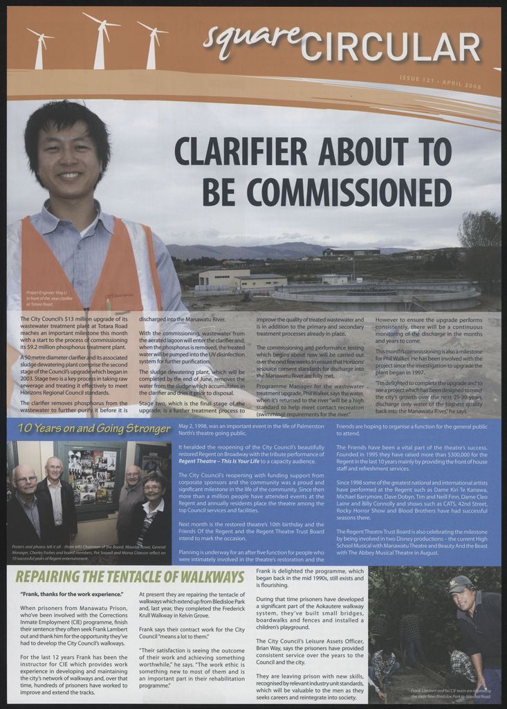The Square Circular was Palmerston North City Council's monthly community publication, informing Palmerstonians of PNCC initiatives, activites, and events. This month's issue includes: wastewater treatment plant, The Regent, prisoners' work experience on walkways, Community Services Council, contact centre, civic awards, sculptures, council engineers, gambling policy, employment, Cambridge Avenue Ashhurst reserve, steam train commemoration, Manawatu Abuse Intervention Network, youth council, Abbie Davie, Te Manawa exhibition, hocket turfs.