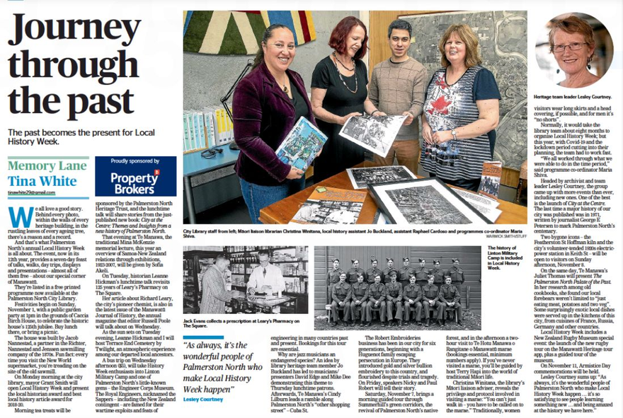 Journalist Tina White's weekly "Memory Lane" article in the Manawatū Standard. The heritage team at the Palmerston North city library celebrates local history week 2020, hosting seven days of events which include walks, talks, day trips and presentations, with the common theme the region's history.