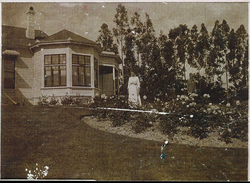 A view of Waimarama, 46 Alfred Street, Palmerston North from the front lawn. Woman thought to be Elizabeth Moore, wife of Thomas Moore.