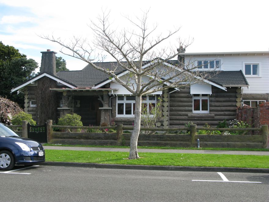 The 'Log Cabin' was built in 1923 by Les Arnott. It was built in the Californian bungalow style but modelled on a Canadian log cabin. The 'logs' are actually bricks covered with concrete. It also has a dendromorphic (tree form) fence, made of concrete and plaster to resemble 'logs'.