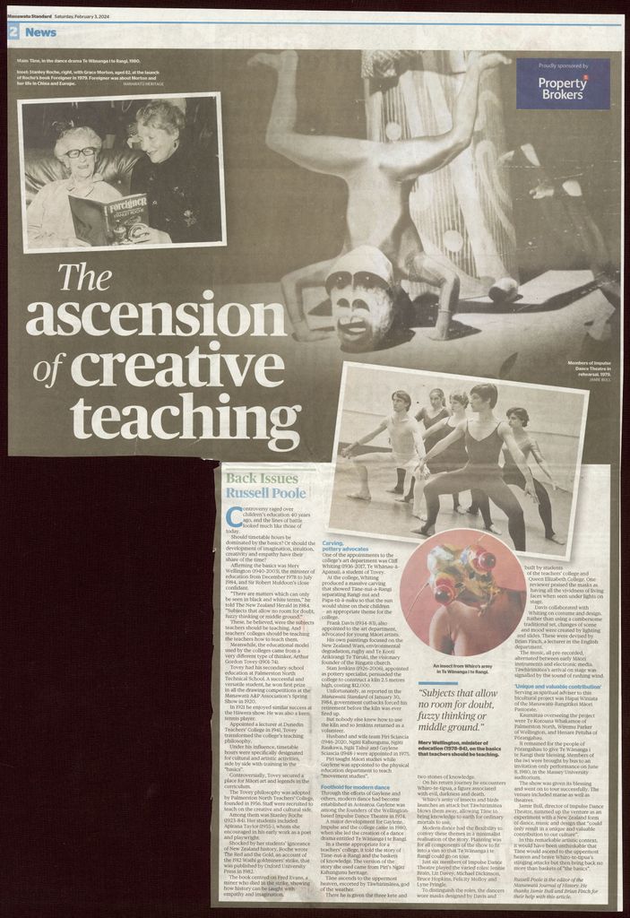 Local historians weekly "Back Issues" article in the Manawatū Standard. The growth of teaching cultural activities and the arts in schools has a controversial history. From its earliest days, Palmerston North Teachers' College staff were recruited to teach a broader curriculum than just the recognised basics. Subjects included Māori studies, carving, pottery and modern dance.