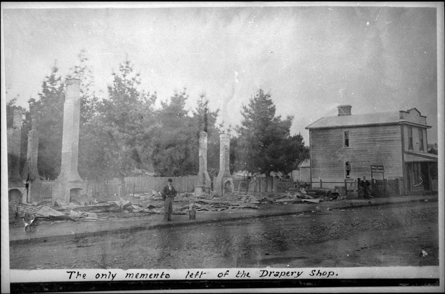 This image is thought to show the aftermath of a large fire that occurred in Ashhurst on 14 June 1902. The Manawatu Evening Standard reported: "The most drastic fire in the annal of Ashhurst took place this morning at about 3.30 o'clock, when a number of buildings in the main street were totally destroyed - namely, the Public Library, Bauckham's Ready Money Store, Brewer's Grain Store, Mr Bruce Beale's office, while West's chemist building was badly scorched and the stock badly damaged by water.