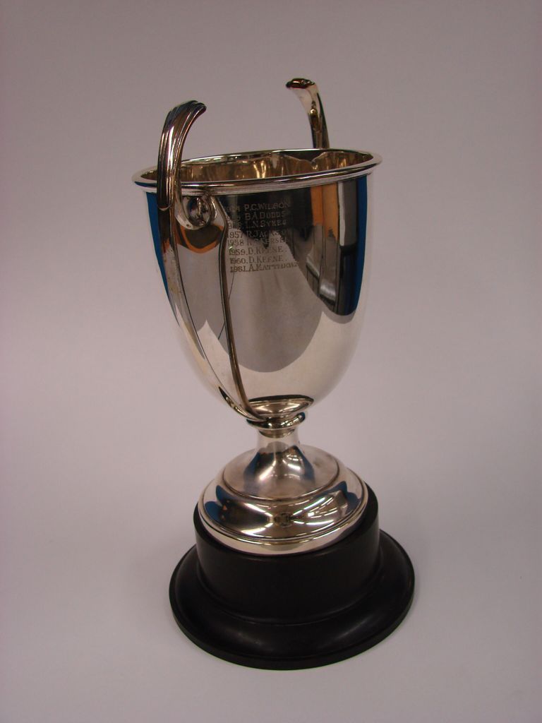 A 355mm tall silver trophy cup with thin curved handles on each side. The cup is engraved 'Collinson & Sons Cup Presented to PN City Council Employees Employees 100 yards HDCP'. The cup was awarded annually from 1934 to 1961.