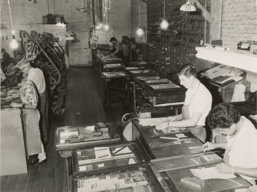 A number of type setters preparing the daily newspaper at the Manawatu Evening Standard. The Manawatu Evening Standard, launched in 1880, was the first daily newspaper in Palmerston North.