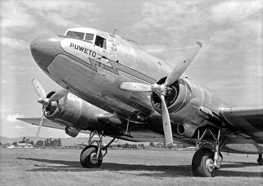 Douglas DC-3 ZK-APA aircraft [Puweto], thought to have been taken at Milson Airport, with the Royal Mail insignia panted near the cockpit.This airplane was used for military and civilian purposes. This photograph was almost certainly taken after 1947.