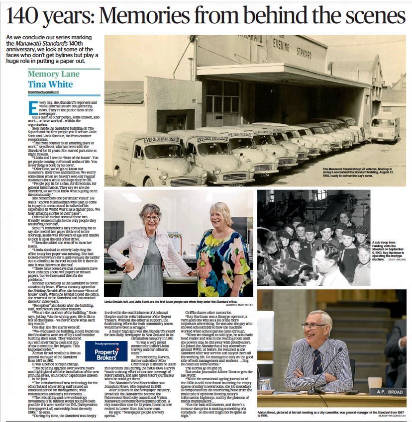 Journalist Tina White's weekly "Memory Lane" article in the Manawatū Standard. On the paper's 140th anniversary, staff and former staff from the Manawatū Standard share customer services stories and back-room memories. With contributions from Linda Sinclair, Julie Scott, Adrian Broad, Mike Griffin, Alister Browne.