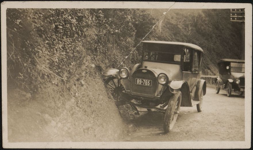 Dated from the 1920s and 1930s, this photograph album depicts events on the Manawatū Gorge road including construction and repairs of the road, removing slips, car accidents etc. The album also contains images of Napier following the earthquake of 1931. The photographs were shot by William (Bill) Brockie. Individuals are unidentified.
