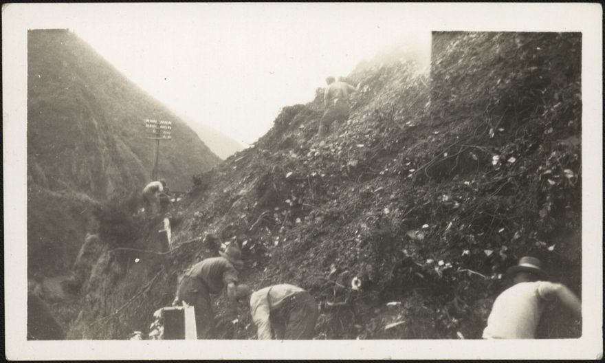 Dated from the 1920s and 1930s, this photograph album depicts events on the Manawatū Gorge road including construction and repairs of the road, removing slips, car accidents etc. The album also contains images of Napier following the earthquake of 1931. The photographs were shot by William (Bill) Brockie. Individuals are unidentified.