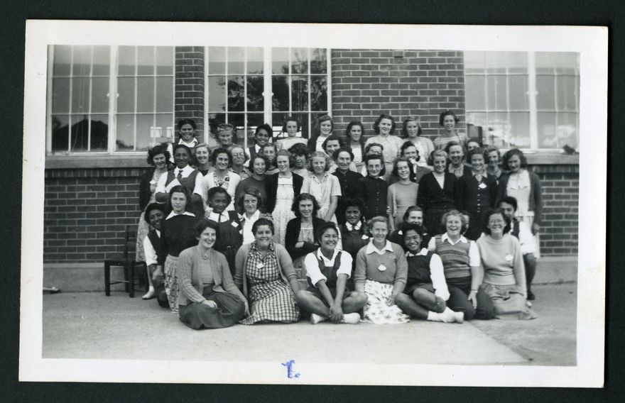 A group of campers and leaders from the Presbyterian Bible Class at an Easter Camp in Terrace End. From left. 5th row: all unknown. 4th Row: Miss Mitchell, Turakina Maori Girls College Staff (3rd); Jean Hay (4th); Elayne Thompson (5th); Miss Smith, Turakina Maori Girls College Staff (6th); Florence Bailey (7th); Joy Goodfellow, Palmerston North Girls High School teacher (9th); Margaret Hubbard (10th); Margaret Robertson, daughter of Presbyterian minister, Marton (11th). 3rd Row: Carol Cleaver (4th); Isabel Pilkinton (9th); Shirley Brown (10th). 2nd Row: Jeanette Bailie (2nd); Judith Dunlop (4th); Phyllis Ellery, Marton (5th); Jo Port (8th); Beverley Newton (9th). Front Row: Unknown; Pat McChesney, Marton (2nd); Jean Coleman, Marton (4th).