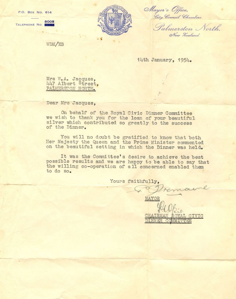 A letter written on behalf of the Royal Visit Committee, regarding the loan of silver used at the Royal Dinner on the occasion of the visit of Queen Elizabeth II and Prince Philip, the Duke of Edinburgh. The Royal couple visited Palmerston North 7-8 January 1954, as part of their tour of New Zealand. They stayed at the Grand Hotel and a Royal Civic dinner was held in the C M Ross Co. Ltd tearooms in the evening.