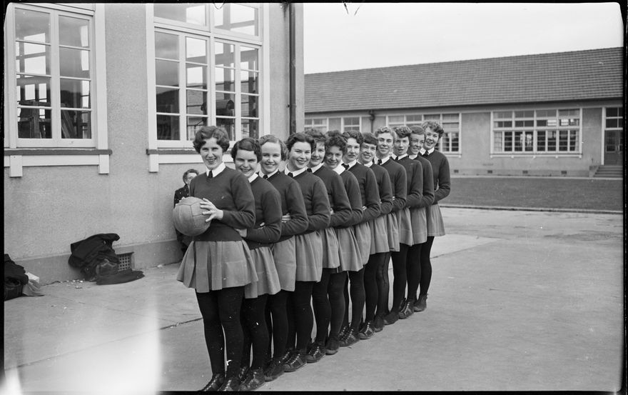 This image was taken for a story that ran in The Manawatu Evening Standard on 29 July 1958, page 11: "The Manawatu basketball team will play in Rotorua at the New Zealand tournament at the end of next month. The team (from the left) is D. Thomas (captain), B. Steffersen (vice-captain), W. Vernon, J. Bolton, B. Pyne, I. Litchfield, N. Graham, M. Boswell, J. Bailey, M. Austin, I. Gooding, W. Munro. "