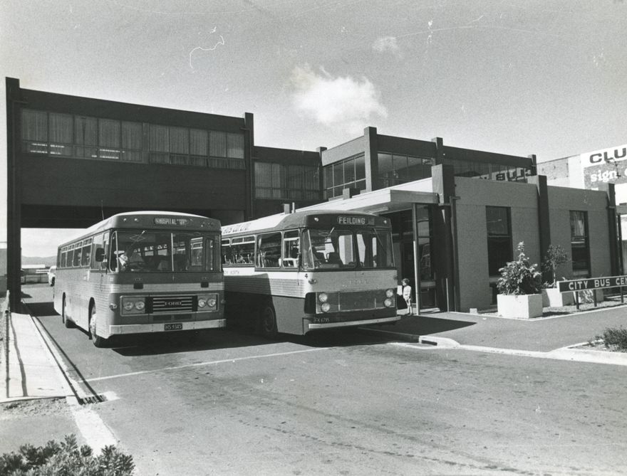 The new bus terminus opened 10 January 1977, for both city and rural buses. From left, buses of: Palmerston North City Corporation; Rutherford Bus Company (Palmerston North to Feilding service). This photograph was published in the Manawatu Evening Standard 11 January 1977.