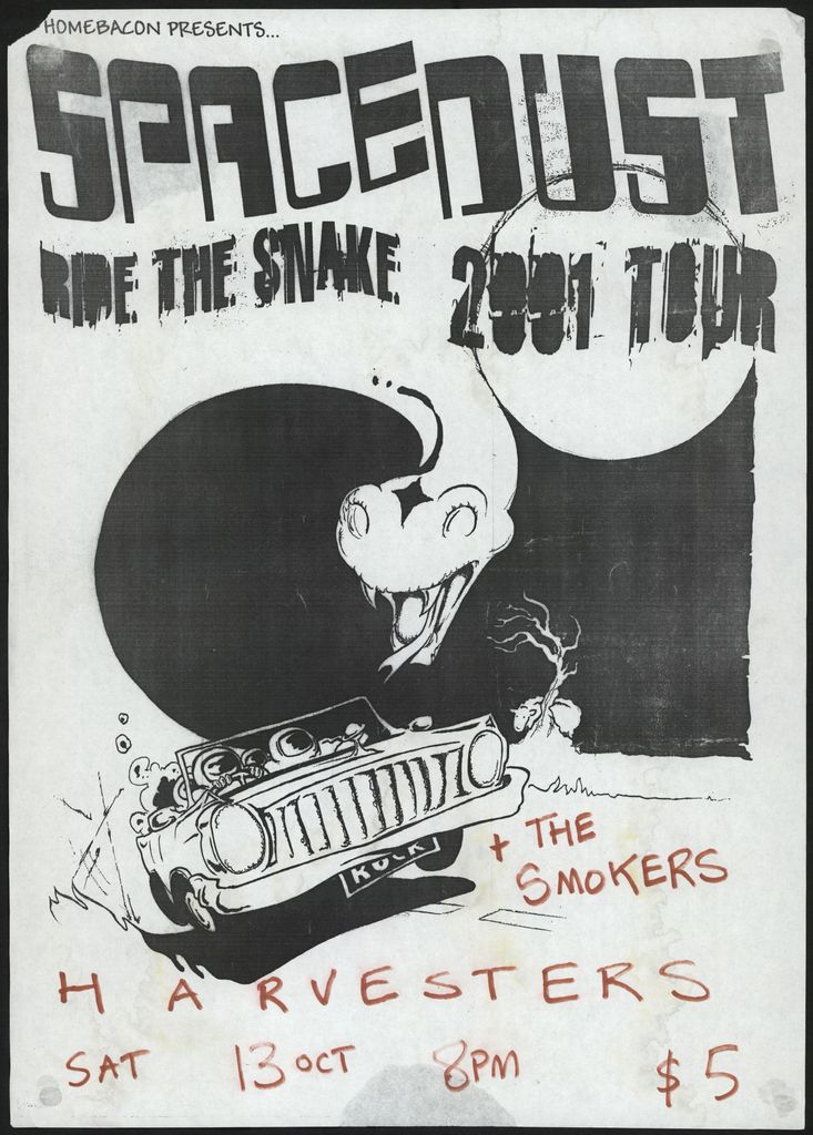 Homebacon presents: Spacedust. Ride the Snake 2001 tour. The Smokers. Harvesters Sat 13 Oct 8pm. $5.