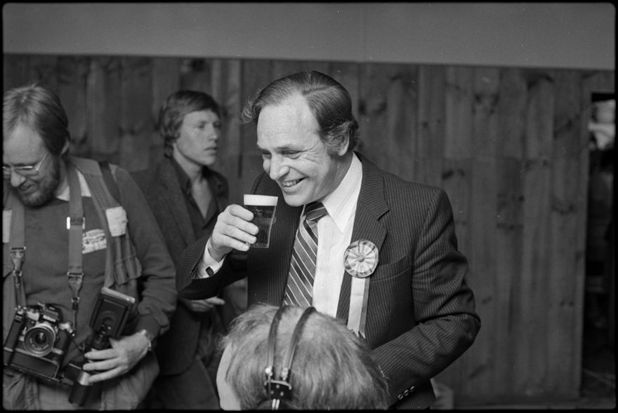 This image was taken by the Evening Standard on Saturday 28th of November 1981 but was not published. It depicts Social Credit leader Bruce Beetham celebrating his successful campaign for the Rangitikei parliamentary seat, with his wife Beverley and various supporters at the Victory Hall in Marton.