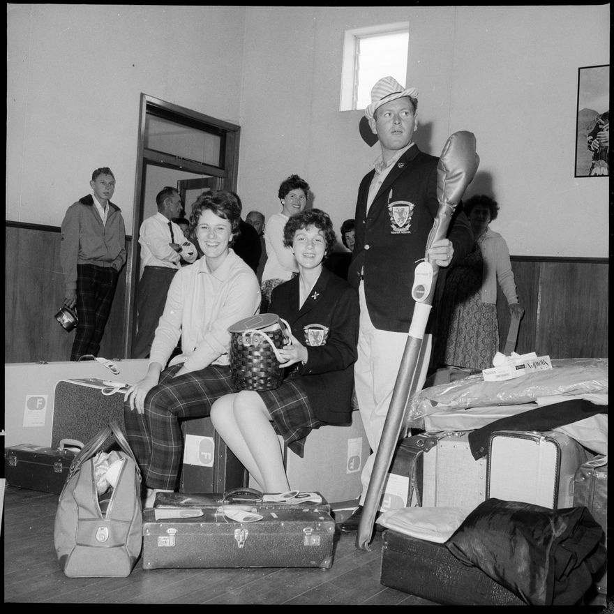 This image was taken for a story that ran in The Manawatu Evening Standard on 9 January, 1964. "Relaxing after finding their luggage, and discovering who that would be billeting with in Palmerston North, were these members of the St. Andrew's Heather Pipe Band yesterday. The band, formed from the Scottish community in Wagga Wagga, Australia, is on a singing and piping tour of New Zealand. Shower shortly after their arrival in the city are Miss Margaret Sly, aged 20, Miss Kerry Pithers, aged 17, and Mr K. Brown, aged 27."