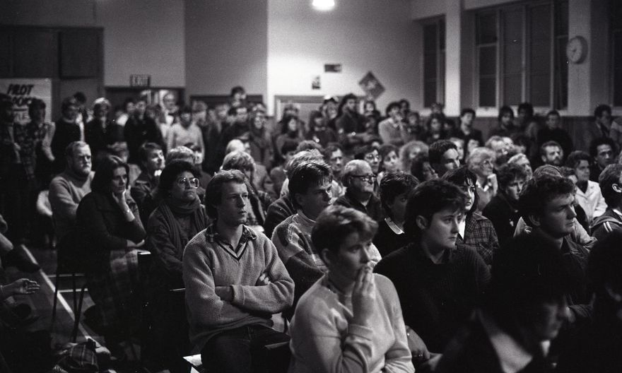 Some of the 300-strong audience who filled the YMCA hall in Palmerston North last night to hear speakers, including Wellington Central MP Fran Wilde … support the Homosexual Law Reform Bill.”