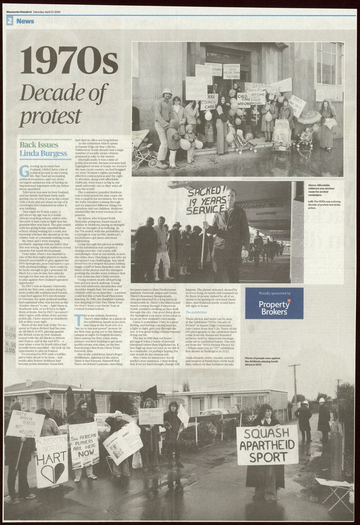 Local historians weekly "Back Issues" article in the Manawatū Standard. A photo exhibition at Square Edge includes thirty photographs from the Manawatū Standard archives, showing local protests and demonstrations. The exhibition reflects on several protest and strike action campaigns in the 1970s, culminating with images from the 1981 Springbok Tour protests.