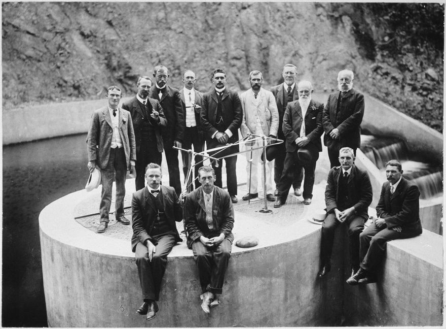 This photograph shows a group of Palmerston North personalities at the opening of the Turitea Dam. Back row, from left: H Palmer, Unknown, A E CLausen, E R B Holben, J A Nash (Mayor), W Stubbs, Unknown, H Haydon, E J Armstrong. Front row: W H Collingwood, H Canton, S Jickell, W Barnard (fire chief). In July 1888, the Palmerston North Borough Council accepted a scheme to bring water into the city at a cost of £18,350. The contractors were Coates and Metcalf of Hamilton. The dam was situated 7 miles east of Palmerston North and the water was piped first to a reservoir on Tiritea Hill and then to the city over the Fitzherbert Bridge. A second dam was built in 1906-1907 and re-opened after being raised in height on 17 February 1913.