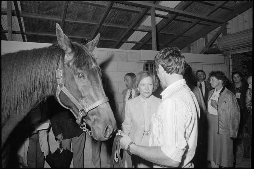 This image was taken by the Evening Standard on the 11th of February 1984 but was not published. It depicts former United States president Jimmy Carter and his wife Rosalynn visiting Highden Park - Herrick and Judy Perry's thoroughbred stud farm at Awahuri.