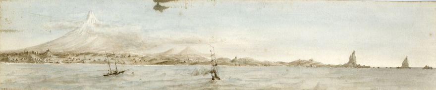Drawing entitled "Taranaki from seawards 1858", handwritten on the back. It depicts two sailing ships, with Taranaki, including Mount Taranaki, in the background The drawing is in ink and water colour. Drawn on card measuring 27 x 5.5 cm. While the artist is unknown, this drawing was gifted to the donor by the son of J. T. Stewart, Government Surveyor.