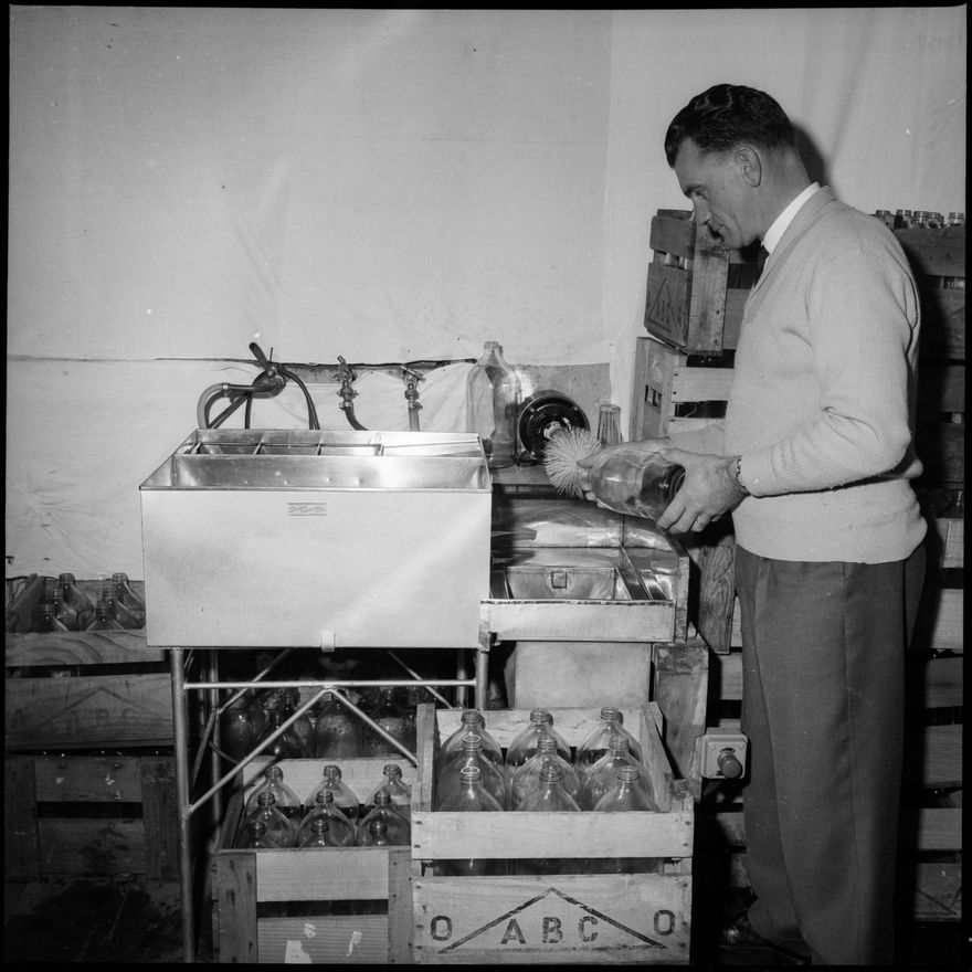 This image was taken for a story that ran in The Manawatu Evening Standard on 14 June, 1963. "Mr. P. Davies operates the automatic stainless steel flagon washer."