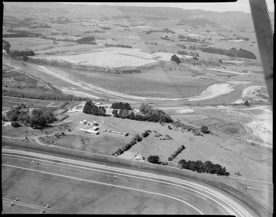 The sewerage treatment plant beside the Manawatu River opened in 1968, replacing the septic tank and filter beds which had been in use since 1905. Some images from this collection have been digitised from prints housed in other archival collections. This image is from an original negative.