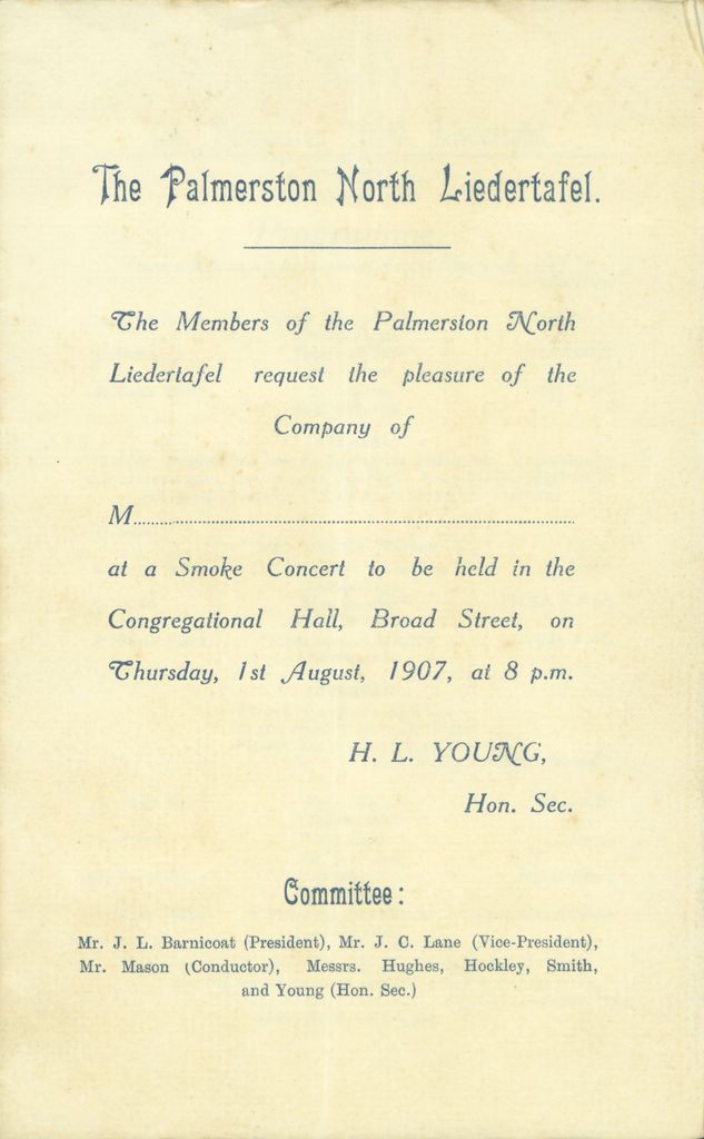 Invitation to, and programme of, a Smoke Concert held in the Congregational Hall, Broad Street, Palmerston North on 1 August 1907. From the archive of the 'Palmerston North Liedertafel'.