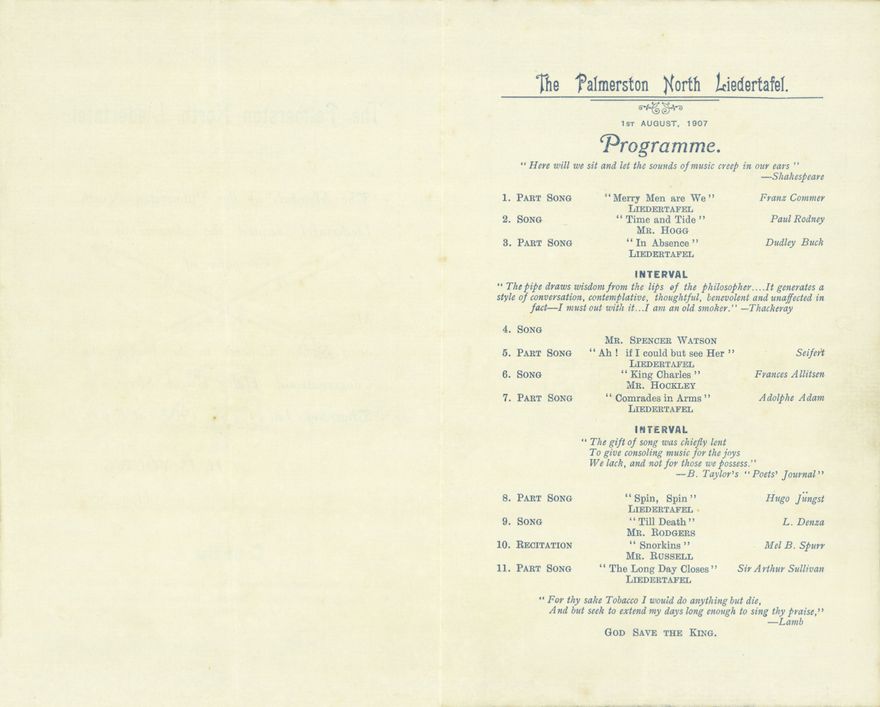 Invitation to, and programme of, a Smoke Concert held in the Congregational Hall, Broad Street, Palmerston North on 1 August 1907. From the archive of the 'Palmerston North Liedertafel'.
