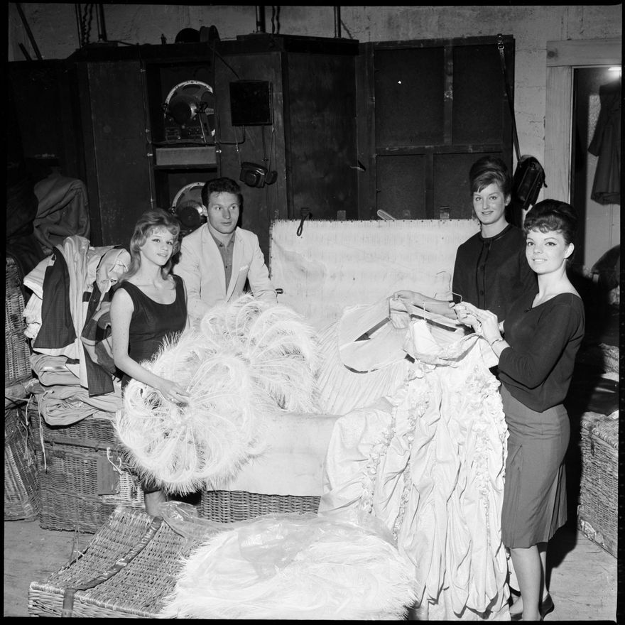 This image was not published in The Manawatu Evening Standard, taken on 3 May, 1963. [Three women and one man display Ziegfeld Follies costumes and fans in a room.]"