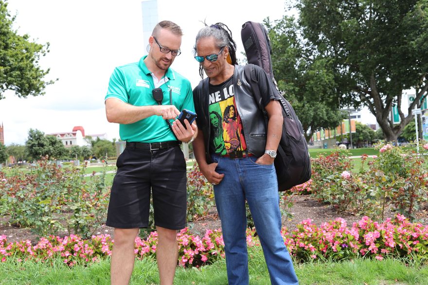 City Ambassador Nathan Martin provides directions to street busker Cool Jams.