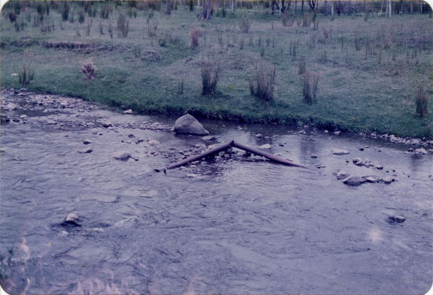 A piece of 4 inch cast iron pipe lying in the Kahuterawa Stream, part of the Fitzherbert West Water Race Scheme which was built in 1917 to supply farms with water in the Fitzherbert West area. Pipes were installed in the stream to transport water down to a settlement box, which removed the silt and debris, and onto the farms.