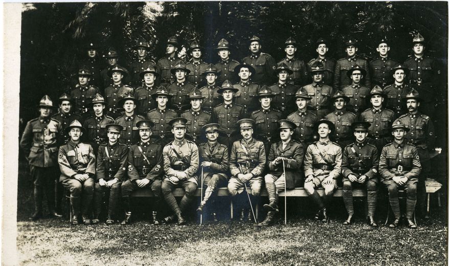 Awapuni Racecourse was home to one of New Zealand’s largest training camps in World War One, and was the sole location for training the New Zealand Medical Corps. staff. Henry Ward is standing in the second row, third from the right.