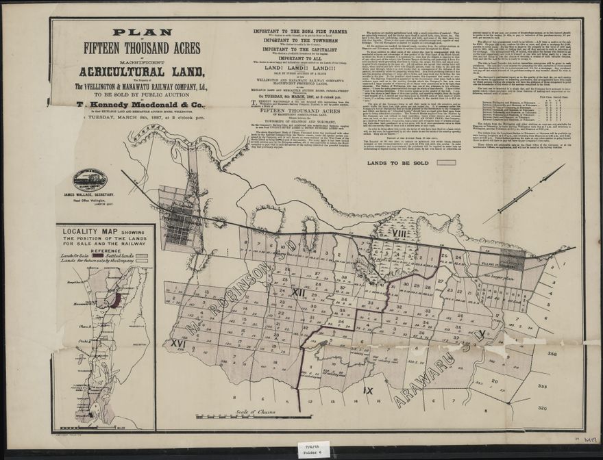 Land sale map showing the sections for sale between the Tokomaru and Shannon areas. The land had been allocated to the Wellington & Manawatu Railway Company.