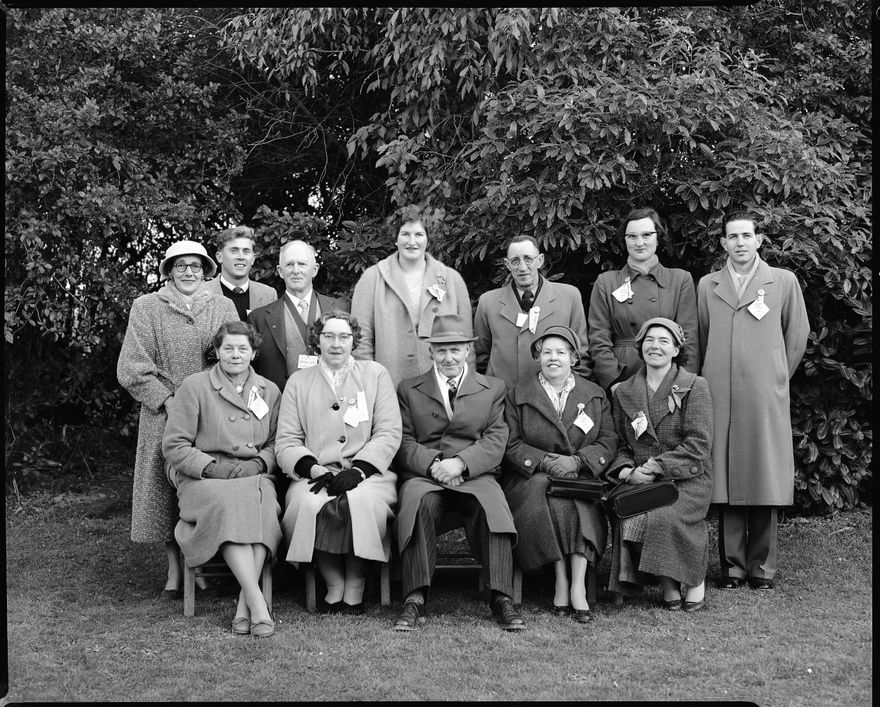 A group of twelve people attending a school jubilee, possibly the staff of the school. This was possibly the Jubilee celebrations for Bunnythorpe School, which opened on 13 August 1883 and would have celebrated its 75th anniversary in 1958. This negative comes from the Elmar Collection - a large series of semi-identified and unidentified images from the 1930s-1970s.