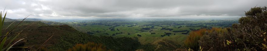 Panorama photograph from the high point of the Otangane Loop Track, The Nipple, at 650m above sea level. The view takes in the area around Pahiatua to the northeast and Mangahao river. Kopikopiko and Naenae roads lie directly beneath this area. The Otangane Loop Track is accessible via the Sledge Track.