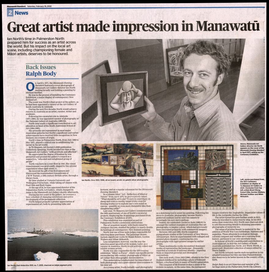 Local historians weekly "Back Issues" article in the Manawatū Standard. The career of 1969-1971 Manawatū Art Gallery director Ian North. During his two years at the gallery he made a significant contribution. At the age of only 24, he oversaw a busy schedule of changing exhibitions and active development of the permanent collection. His work includes the curation of 16 paintings by contemporary New Zealand artists, purchased from the 1971 Centenary Exhibition.