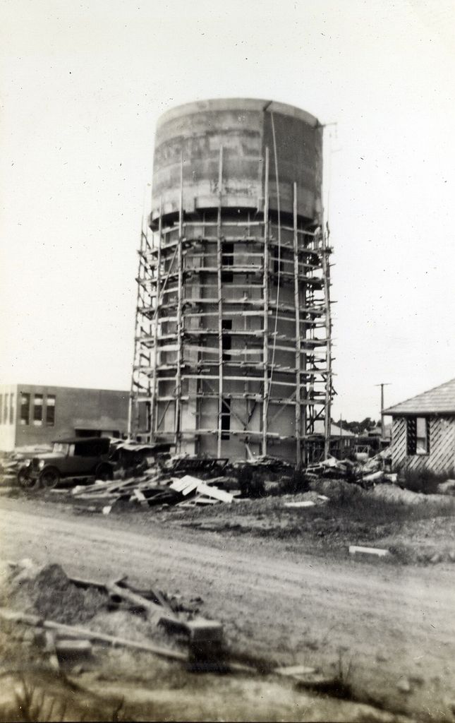 Ohakea Air Force Base was constructed on land near Bulls in the Manawatu, 1937 to 1939. It was built in anticipation of the arrival of bombers, ordered for delivery in October 1939. The initial construction included housing and maintenance facilities for the new bombers, workshops, administration buildings and accommodation for servicemen and dependents. Showni s the construction of the water tower. Photograph found in album related to the Humphries family of Greytown.