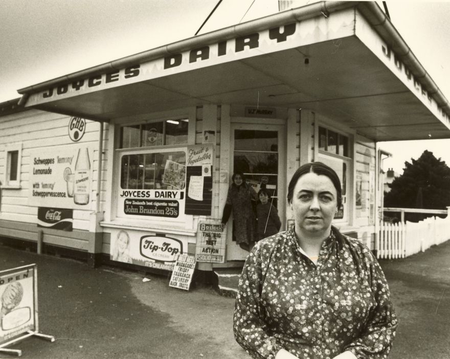 The proprietor of Joyces Dairy, Mrs Val Murray, stands outside the Palmerston North corner shop.