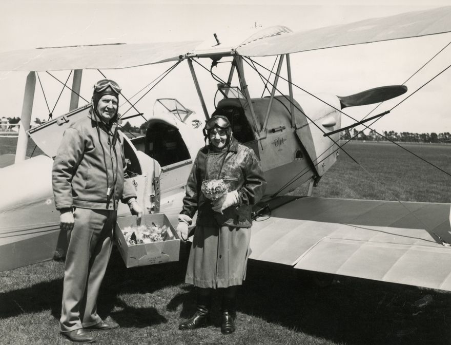 Violet Hibbard (at right) accompanied Captain R Russell on the first flight to land in Palmerston North, 31 July 1920, at the age of 15 years. The flight was re-enacted in 1970 for the Palmerston North Centennial celebrations. This flight was piloted by J J Mackie of Hastings, in his Tiger Moth built 1945, and took 30 minutes. Accompanying them is the 6 bouquets of flowers that Violet Hibbard was to drop over Woodville and Palmerston North, as she did on the first flight.