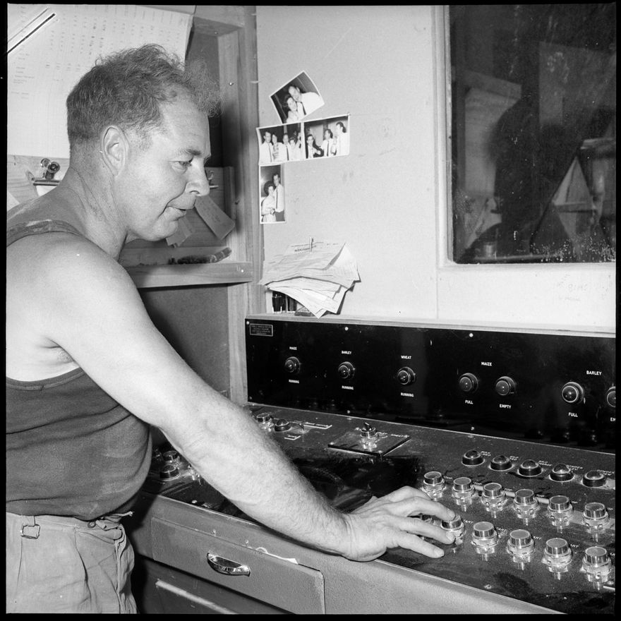 This image was not published in The Manawatu Evening Standard, taken on 7 February, 1964. [Image from a poultry breeders tour the grain silos of Farm Products, Ltd.] Another image of the group was published on 7 February, 1964.