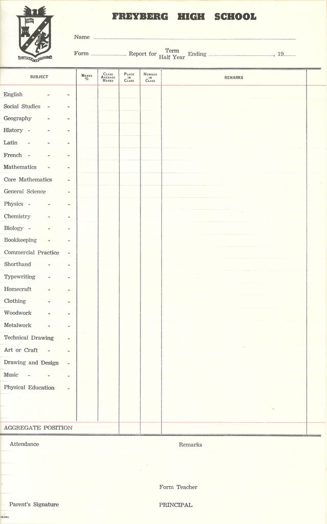 This is the first report template from Freyberg High School, dated 1955. The printers mark reads, "(SIMON)," and it is on lined paper. There are twenty-five subjects listed, with teachers recording the student's: marks percentage, class average, number of students in the class, and individual placement within this range. Attendance was noted and remarks made by the subject and form teachers. Finally the report was signed by the student's parent(s) and school principal.