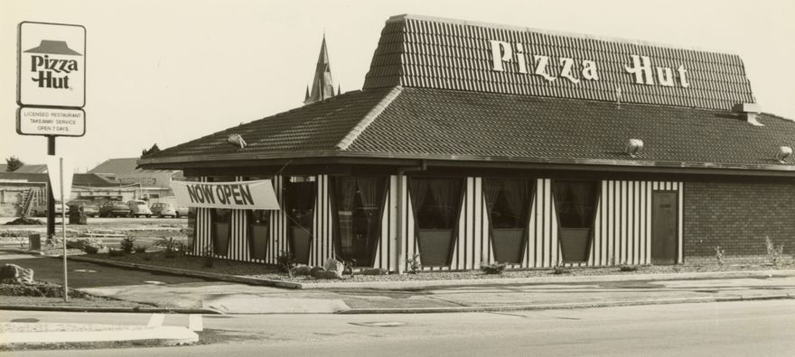 The Palmerston North Pizza Hut was the 16th to be opened in New Zealand. Pizza Hut was part of a 3 stage development of the land with street frontages to Main and Albert and Broadway Avenue. The Bodell family, part owner of the land in conjunction with Realty Development Corporation, had many mature trees on the site preserved. The colonial villa on the corner of Broadway and Albert Street was relocated to a 10 acre block near Feilding. Building currently occupied by a Subway fast food restaurant (2020).
