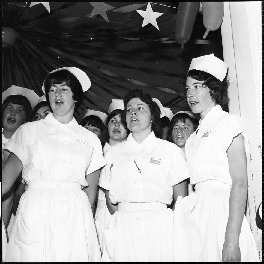 This image was taken for a story that ran in The Manawatu Evening Standard on 29th December 1965 "The nurses' choir at the Palmerston North Hospital sung carols in the children's ward on Christmas morning, for the children, parents and visitors."