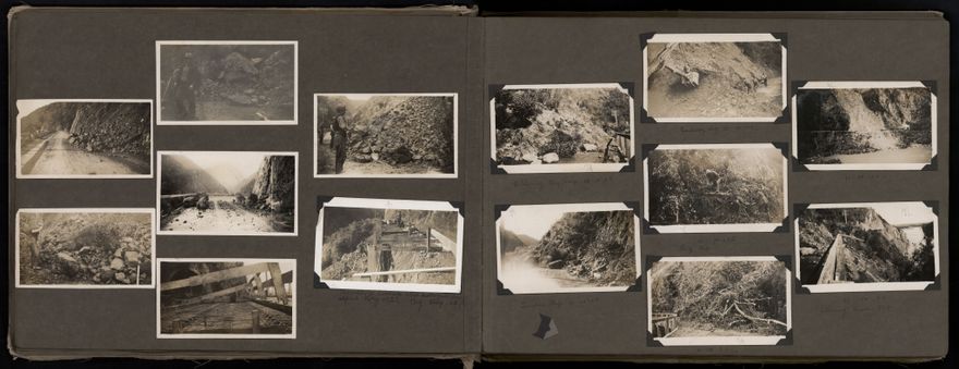 Dated from the 1920s and 1930s, this photograph album depicts events on the Manawatū Gorge road including construction and repairs of the road, removing slips, car accidents etc. The album also contains images of Napier following the earthquake of 1931. The photographs were shot by William (Bill) Brockie. Individuals are unidentified.