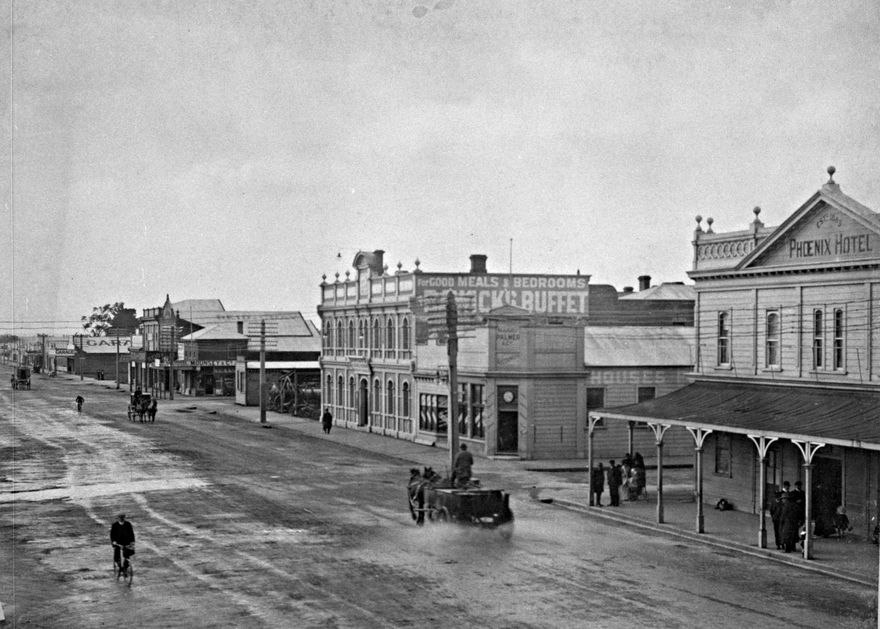 Rangitikei Street from Cuba Street, with Queen and King Streets on the right. Dawick's Buffet was a non licensed hotel and restaurant, and later became The Royal Tavern.