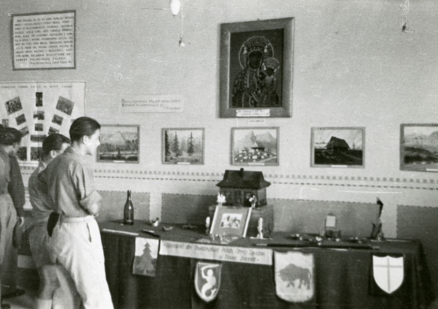 Polish soldiers viewing the exhibition of gifts to be sent to New Zealand, as displayed at Cupra Marittima, italy, during World War Two. The gifts were made by Polish soldiers to give to New Zealand as an expression of their heartfelt gratitude for New Zealand's treatment of the Polish children refugees and appreciation of the great friendship shown to the soldiers through the sending of correspondence and parcels, during World War Two.