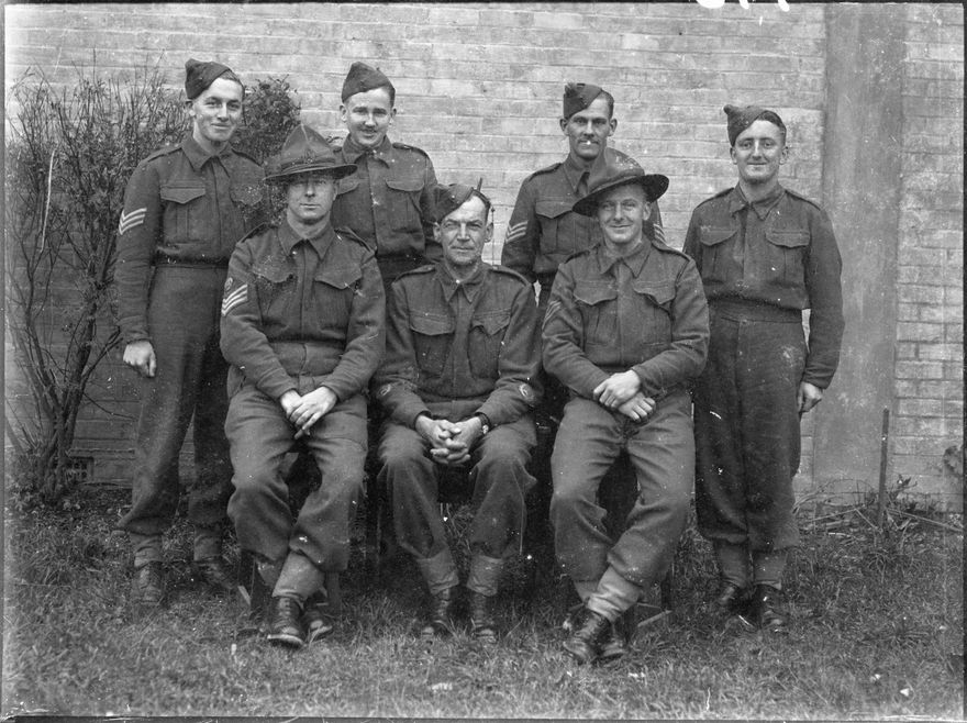 A group of army personnel during World War Two. the location is believed to be local as the photographer was from a local studio.